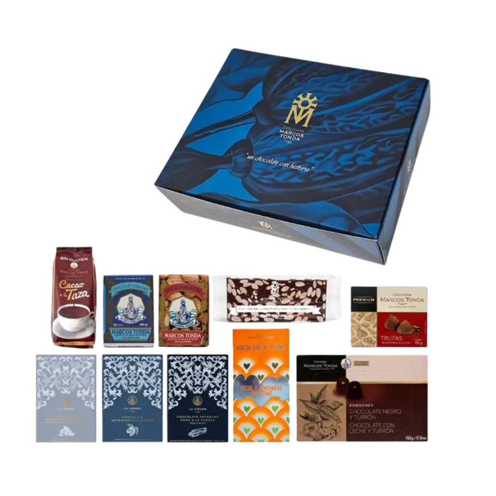 En Chocolates Marcos Tonda elaboramos cajas de chocolate y lotes especiales pensados para sorprender y emocionar en cada ocasión. Cada propuesta nace de una cuidada selección de nuestros chocolates artesanos, combinados con especialidades gourmet de primera calidad como embutidos, quesos y bebidas, creando conjuntos equilibrados y llenos de sabor.