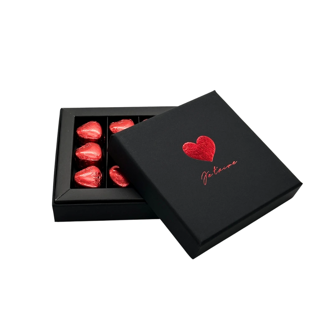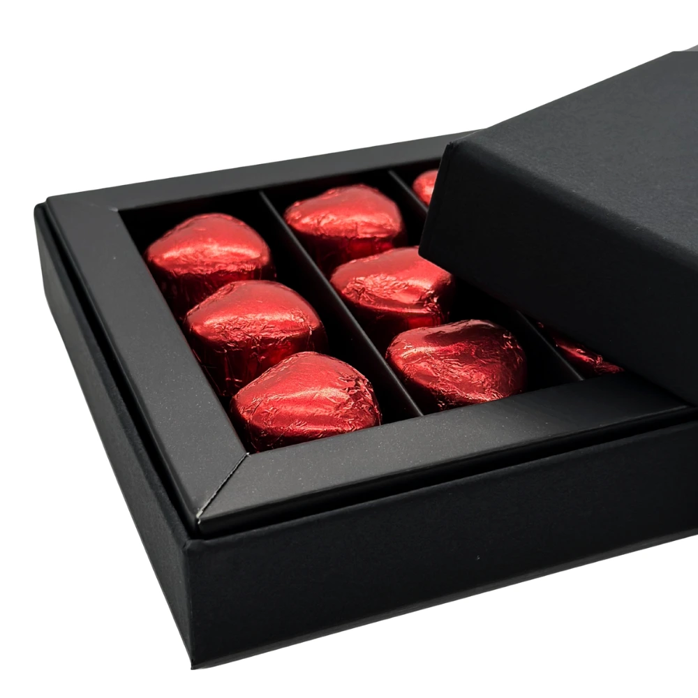 Caja de 9 bombones en forma de corazón sabor avellana, presentada en un elegante estuche negro con detalle rojo. Un regalo delicado, romántico y perfecto para sorprender en San Valentín.