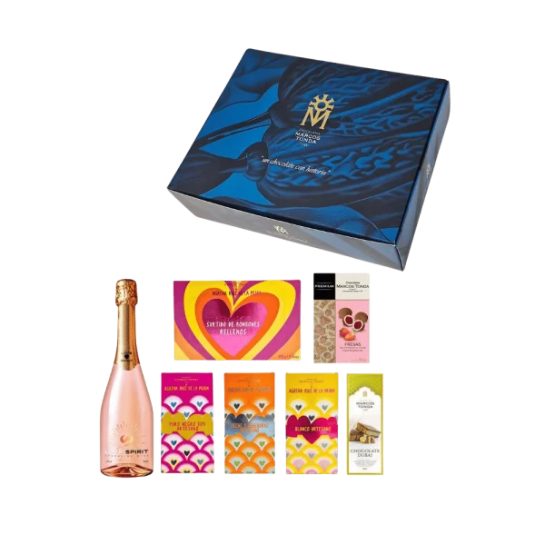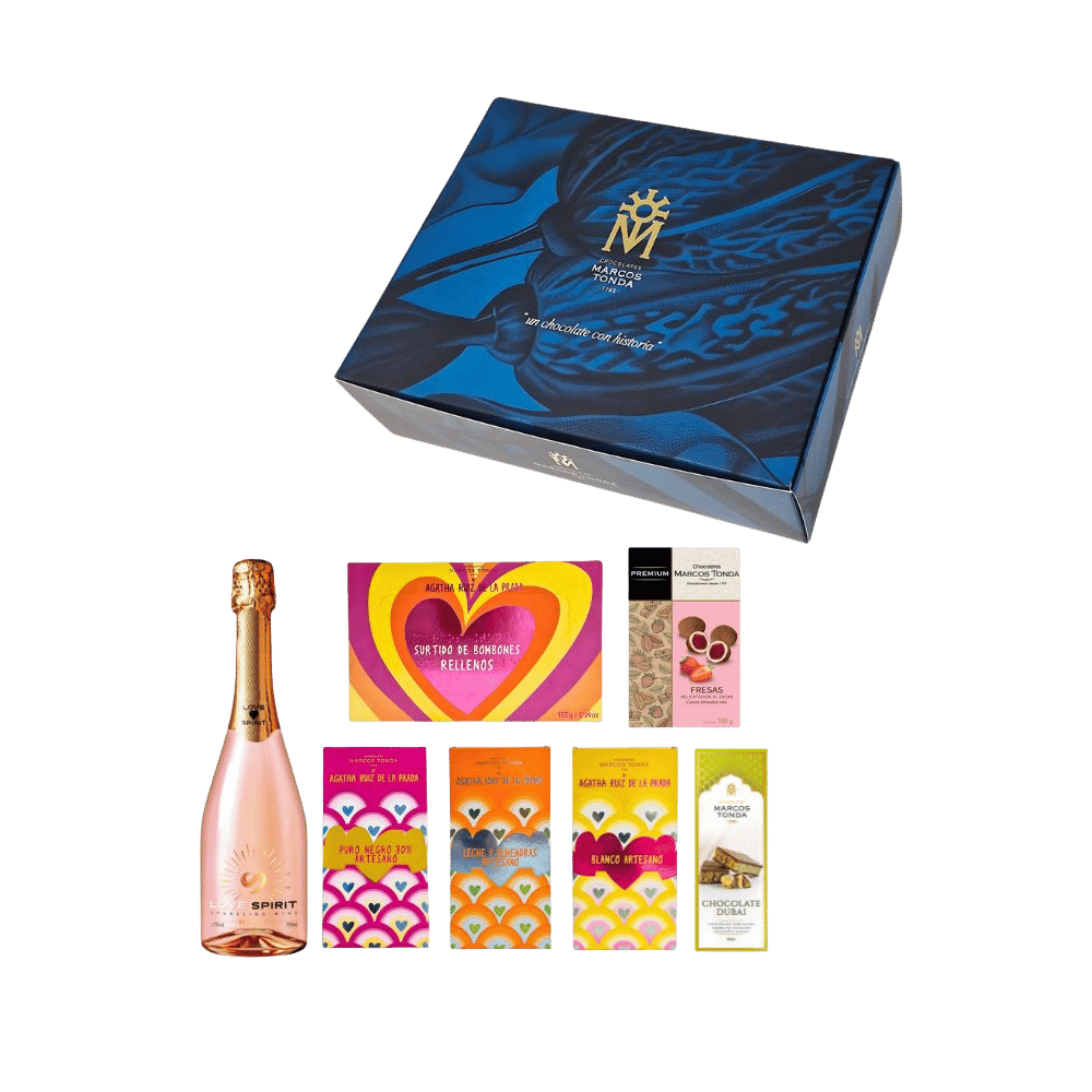El Lote Glow de Marcos Tonda es una propuesta alegre y sofisticada que combina el sabor único del chocolate con el estilo inconfundible de Ágatha Ruiz de la Prada. Incluye una botella de vino rosado Spirit para brindar y una irresistible selección de tabletas en diferentes variedades: chocolate negro intenso 80%, con leche y almendras, blanco artesano y de Dubai. Además, un estuche de bombones rellenos completa esta experiencia dulce y sorprendente.