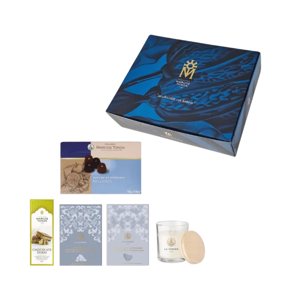 El Lote Dubai es un regalo sofisticado que combina la tradición chocolatera con un toque exclusivo. Incluye la tableta especial de Chocolate Dubai Marcos Tonda, un surtido de bombones rellenos y chocolates artesanos de La Virgen en distintas variedades. Como detalle diferencial, incorpora una vela aromática premium, que aporta calidez y elegancia a la experiencia.