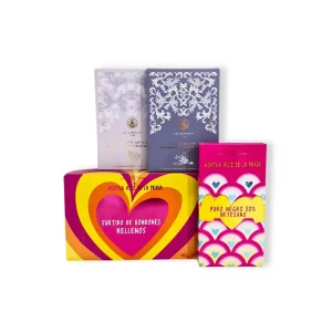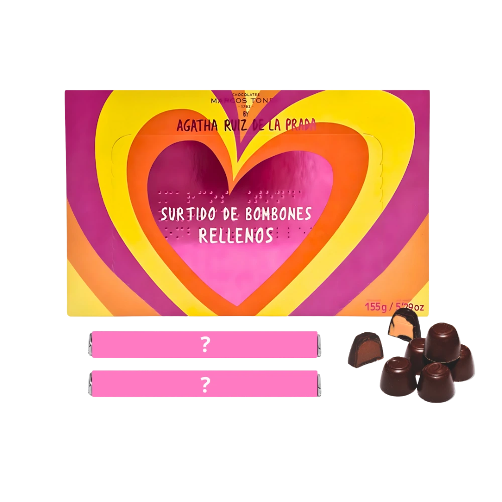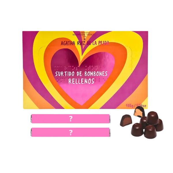 - Caja de bombones Agatha Ruiz de la Prada: Cada caja contiene una selección de bombones con cuatro tipos de relleno: trufa, naranja, avellana y cappuccino, todos con una cobertura de chocolate suave y de buena calidad.